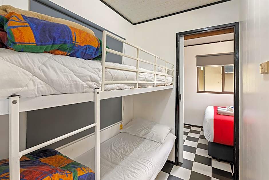 Features a gas stove, full-size refrigerator, TV and DVD player.